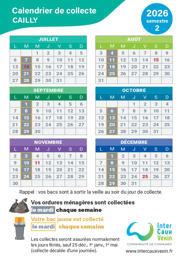 - En cas de jour férié, toutes les collectes de la semaine seront décalées de 24 heures.
